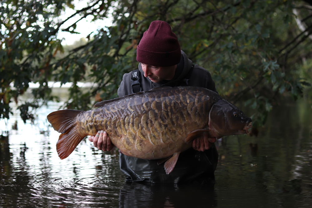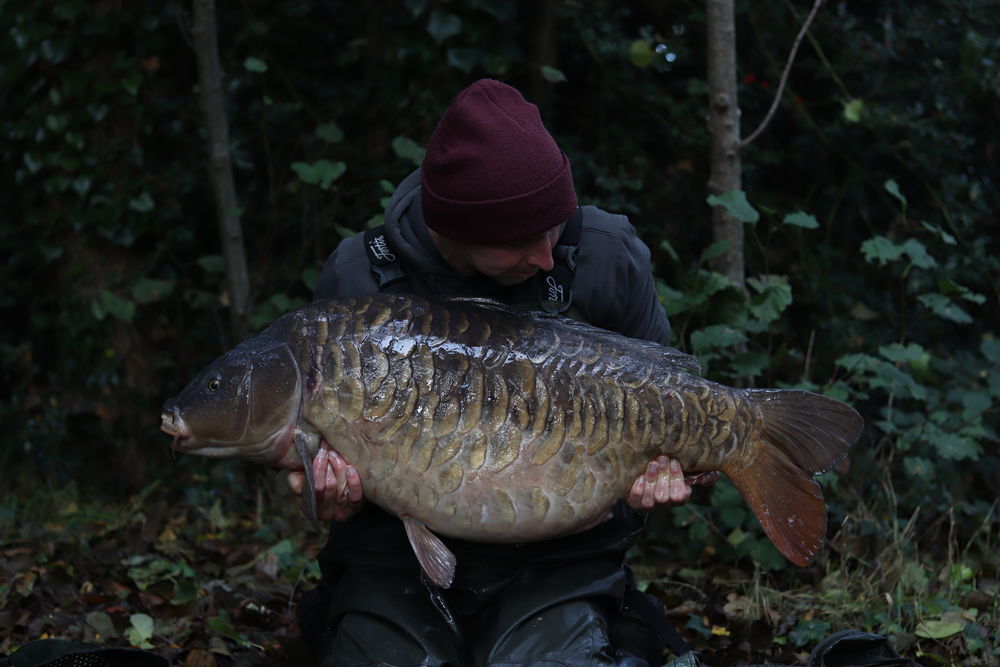 I got to frimley pit 3 for my latest 48hr session, and after a lap of the lake i saw 4 shows out in the middle zone of the lake, so i decided i would get my gear from the van and head to the swim closest to the shows, when on my back round with the barrow, i walked past a swim along the bar and noticed few patches of fizzing coming up so i decided in stead if the middle zone with the show i would now act on the clear feeding activity and set up in this swim imstead. I am very glad i did as after getting the rods out with half a kilo of cell and prototype boilies over each rod the next morning produced 2 bites in 10 minutes with the first a 24 common followed shortly after by one of my targets, the Big Fully at 46lb on the button, over the moon to catch this fish not only is it a real mega looker but it is also nearly 20 years older than i am