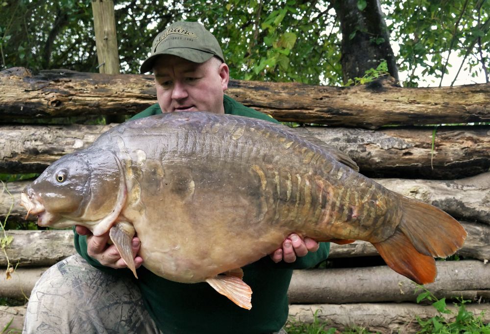 I arrived at the lake with a SW wind blowing and my favoured swim was already taken by a mate who was catching well so I opted to fish a swim called the right hand point which gave a lot of scope for spots and was an area renowned for big fish captures over the years. I usually fish quite long in this swim to a couple of spots in the 21 wraps range but found a decent spot a lot closer at 13.5 wraps for the right hand rod on a very hard area near a small gravelly patch. I fished the left hand rod on the long spot and baited both rods with 10 spombs of chops and whole boilies of 10, 15 and 18mm sizes so my dumbbell hookers would blend in well as usual with the freebies which also received a liberal dose of the Cell stick mix liquid as standard. The wind began to gust in intensity and the rain came in intermittent showers but when the rain stopped there were fishing showing everywhere the following morning. My neighbour to the right had a 27lb linear and a 31lb mirror and about an hour later whilst finishing off a cuppa at around 08:00, the short range rod was away! I pulled into the unseen adversary and knew it was a decent fish by the way it held its ground with slow purposeful moves whilst it was no doubt formulating a plan on how best to shed the hook. It went on several powerful runs until eventually the fight was under the rod tip and I was on a platform over the water making it easier for me to prevent it getting too far to the right on my margin where danger lurked in the form of branches and the likes. After around 7-8 swirls on the surface it began it realise that resistance was indeed futile and the size 4 korda Kurv Shank hook was embedded to the apex of the bend so it was never coming off. At this point I coaxed it to the net and gently drew it up around the fish as she approached the block. After putting the rod on the deck I peered into the net and realised from its unique shape that I had nailed another of the K1 A-Team in the form of a mirror known as the "Ugly Sutton" which spun the needle round to 38lb 13oz! These fish are loving the cell prototype bait combo and seem to be helpless in resisting the pull of the cell dumbbell hooker/topper arrangement. I truly can't believe the season I am having at the moment and there are only really 5 of the known fish to catch on K1 for me to say job done! Those include the famous Starries (a big mirror that has hit 54lb+), the Mug Sutton which is a stunning 40lb+ mirror, a dark fully scaled known as "The One" which is a low 30, a character mirror known as "Blind Eye" which goes upper 30's and a really old two-tone common known as "The Denge Common" which is a mid 30. Keep peeled on the catch reports to see how I get on as we head in to Autumn, hopefully the remainder of the A-Team will fall to my rods before the onset of winter when K1 pretty much shuts down for bites.
