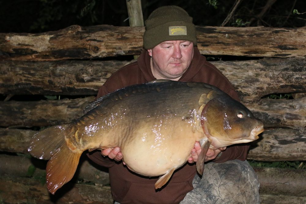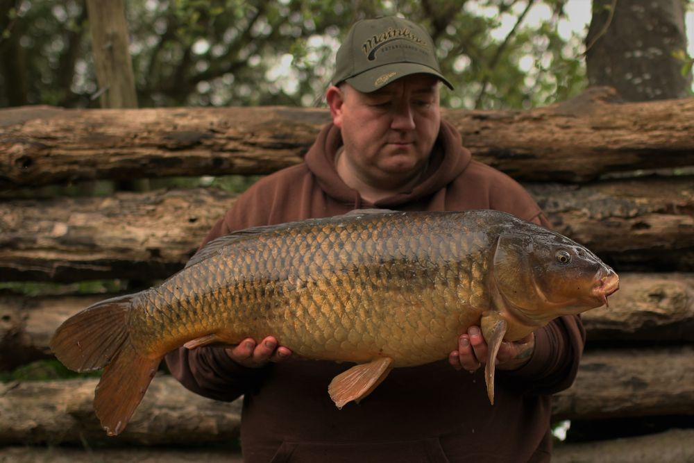 I moved in to a swim which commands a lot of water in the central part of the lake and as it was late in the afternoon an not wishing to lead a round too much, the chap next to me told me about 2 spots at 21 wraps. I had 2 casts on each spot and they were as he said so that was good information and my starting point for the trap setting. I initially had one rod on a chod rig and one on a Ronnie rig but having lost a fish for no reason on the Ronnie rig and having an odd (aborted) take on the chod rig, I opted to fish IQ D-rigs on both rods which I had previously caught well on. One rig was baited with a cell dumbbell hooker and a yellow cell topper and the other rod was a 15mm cell boilie (soaked in Cell hookbait enhancer) topped with a 12mm milky toffee pop up so both were fished snowman style. I had the first of the fish on the new rigs around 16:00, 4 hours after losing one at the net and it was a fighting machine torpedo of a common and there was a lot of activity in the swim. That evening I baited up with 4 kg of halved and whole 15mm & 18mm boilies and I was getting a lot of liners on both rods. At 22:00 on the left rod(3rd bit on that) I had a few bleeps intermittently for around a minute then it tore off. The result was a really wide mirror of 37lb 8oz and to be honest I thought it was a forty but it lacked the length. They were on the bait. The following morning it was bleeps and liners galore and at 10:00 I was packing up and talking to a chap who was looking for a spot and after telling him about this swim and my action some 20 minutes later, literally moments before reeling in, the left hand rod was away again and this time a 38lb 2oz mirror known as DC graced my net. 5 fish caught, 1 lost, and two of those fish were upper 30's, I went home happy and the cell was doing the business for me again