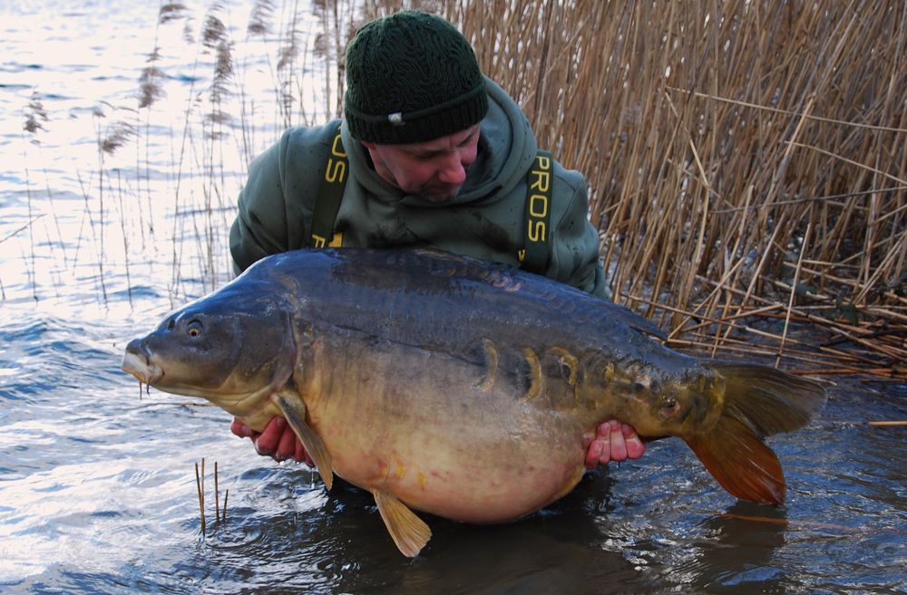 Fishing has been very slow on the pit the last few weeks. The swim I wanted was occupied but my second choice was free. I put the middle and righthand rod out to the right on some gravelbars. My lefthand rod was fished straight forward on a gravelbar close in. I baited that rod with some sweetcorn, maggots, casters and Cell pellets and give them a good squirt of the lovely smelling sweetcorn smart liquid. I fished a pink pineapple wafter attached to a spinnerrig on top of all those goodies. The night passed by quietly but after a hailstorm the left rod was flying. I ended up in the middle of the pit before I managed to get over the fish. I could clearly see wat I was attached to in the clear water and my thoughts were comfirmed once I had her in the net. A new PB!